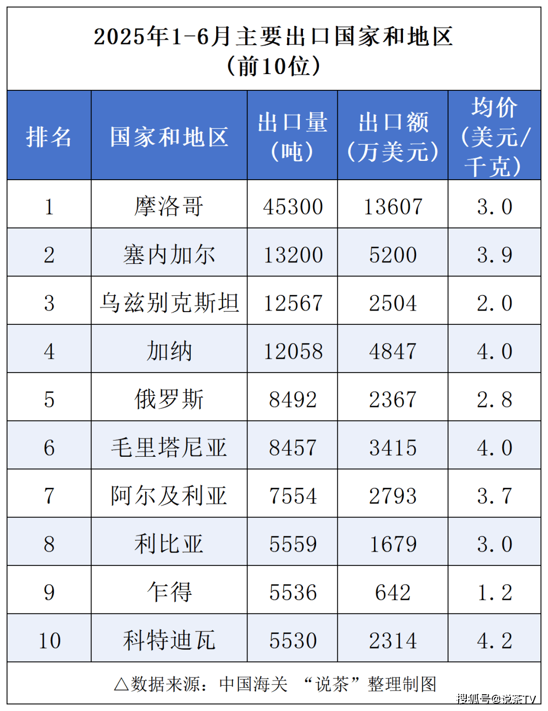 值得关心的是,近十年来,国内出口均价不变维持正在每公斤4美元以上,期间最高达到6。22美元,然而这一态势正在客岁初次被打破,价钱跌破4美元关口,降至每公斤3。79美元;本年上半年价钱继续下行,目前已跌至每公斤3。6美元。茶叶出口均价处于下行形态。可见,市场所作中,茶叶外贸价钱仍然承压。魏有认为,近年来国内出口价钱确实存正在虚高成分,当前的回落具有合。同时,出口产物布局取市场分布正正在发生变化:大包茶出口量增加,小包茶出口则呈下降趋向;且出口量排名前十的国度中,均为西北非、中亚等成长中国度,缺乏发财国度市场的支持,必然程度上导致出口单价的逐年走低。
